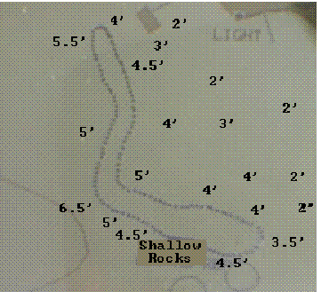 dog-leg had a little deeper reading at 6.5' and there were some shallow rocks on the south side of the southeast end. This is actually what gives the appearance of the breakwater being wider at that end since the boat had to avoid this obstruction. It is important to note that the depth quickly shallows to 2' going immediately east of the breakwater and continues for at least 200 yards. This may hamper any additional construction of the breakwater going east.