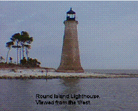 The Round Island Lighthouse was built 3 miles south of Pascagoula, Mississippi in 1833. One of the oldest structures of its type on the Gulf Coast, the 44 foot tall abandoned lighthouse has always had a problem with vandalism, but now erosion threatens to undermine the tower. In 1985 the City of Pascagoula assumed ownership of the lighthouse and pursued efforts to preserve this historic landmark. In 1987, 38 volunteer sailors from the USS Wisconsin stacked 23 tons of cement bags and 14 tons of sand around the lighthouse, but by 1989 this had all washed away. In 1990, an area 500 feet by 30 feet west of the lighthouse was dredged six feet below mean tide and the dirt was placed around the lighthouse and stabilized with 500 pounds of limestone rip rap which was covered with vegetation. However, the lighthouse continues to be threatened by erosion. In January of 1997, Lighthouse Digest placed the lighthouse on it's Doomsday List.