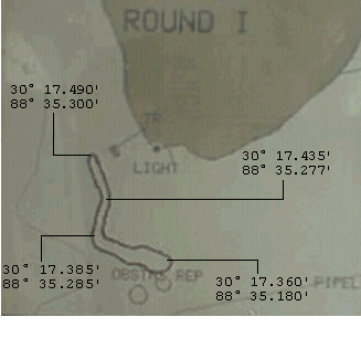 The DGPS Screen image to the left shows the location of the Breakwater in relation to the Lighthouse and Round Island. The Breakwater was simply encircled with DGPS tracking on and then the track frozen upon completion. The Breakwater measures about 1250' in total length. The Lighthouse is located about 500' @ 81° from the northwest end and about 850' @ 353° from the southeast end. Differential GPS Latitude and Longitude coordinates are shown.