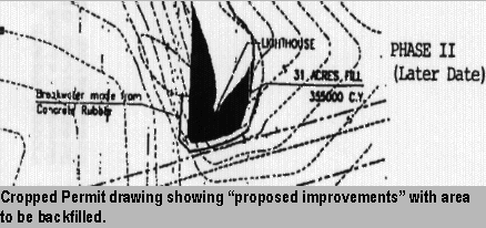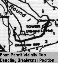 The geographical placement of the breakwater was detailed by Corp of Engineers permit No. MS96-01802-V prepared by Compton Engineering of Pascagoula. The permit describes construction of the breakwater as follows. "Locate the breakwater approximately 820 feet seaward of the mean high water mark on the south end of the island; construct the base 20 feet wide and crest 2 feet above mean high water at the crest." Cropped images from the permit are shown below and denote the intended position of the breakwater and the phase II backfill.