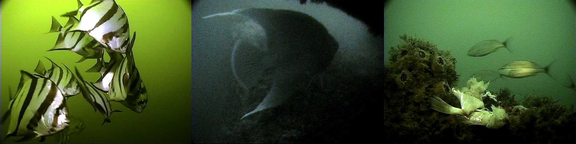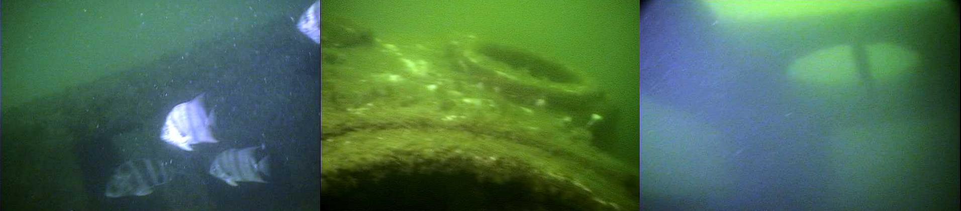 Following the CMB dive a visit was made to the Corps of Engineer's Barge in FH-2. Visibility was only about 10 feet. Most fish here also dominated the upper water although some fish did venture to the bottom. Feeding activity on both structures was slow as fish somewhat ignored bait that was brought down. These observations suggest some water quality problems, possibly some hypoxia or other detriments. Scientific analysis of water samples would be necessary to further determine the problem. A shrimp net was also noted on the structure and most of the upper walls that gave this structure its height are gone, possibly due to shrimping activities. Fish observations included only a half dozen small red snapper, 1 small gag grouper, 3 mangrove snapper, a large blue angel, a dozen small trigger fish, and an abundance of schooling tomtates, blue fish, blue runners, and spade fish. A significant amount of marine growth (grass and barnacles) was noted.
