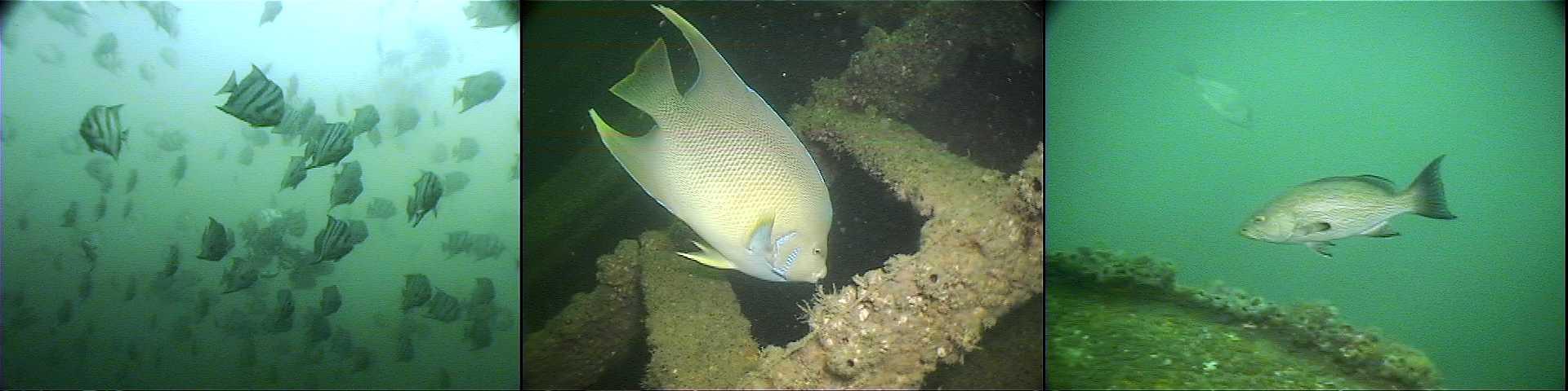 Following the rubble dive, a visit was made to the Dish Wreck. The coordinates of this vessel changed a little since its initial deployment as previously reported. Observations on this day revealed a shrimp net on the starboard bow of the vessel which may suggest that shrimping activities moved the vessel rather than the previously suspected storm activities. The vessel is progressing nicely as a reef and it's height has allowed it to hold much more fish than the neighboring rubble. Visibility on this visit was about 20-25 feet on top of the wheel house. Some deterioration of the rails was noted and some significant marine growth is accumulating. The port ladder rail is gone at the top and the starboard side is detached from the deck and deteriorating. This ladder area makes a good reference area for observations and the fish seem to like this spot. Fish observations included red snapper (50-75/1-3 lbs.), trigger fish (8-10/1lbs.), red fish (3/6-8lbs.), scamp (3/2-4lbs.), red grouper (2/2lbs.), warsaw grouper (1/10lbs.), gag grouper (4/4-9lbs.), sheepshead (2/1-2lbs.), blue angels (2/2-3lbs.), spadefish (75-100), and blue runners (150-200). Most of the red snapper were hanging in the upper water, but later on came down to the top of the wreck to feed on some bait brought down.