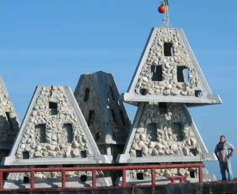 On February 27, these 60 artificial reef pyramids were deployed in groups of five, creating 12 separate reefs split between FH-2 and FH-1. The contractor, Walter Marine (see http://www.reefmaker.com), deployed the Tetrahedron shaped units which are 8 feet tall with a 12 foot base and weigh 3.5 tons each. They have several designs available and this one is called “Florida Limestone” and sells for $995 each. This was the only design that did not move after hurricanes Ivan and Katrina. These units were deployed at the following coordinates: