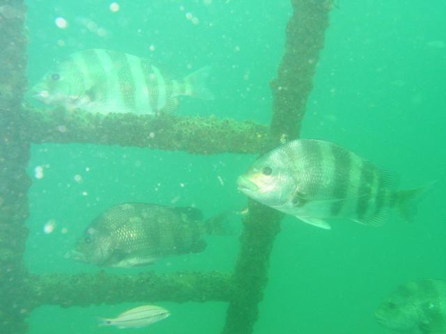 This 48' Shrimp Boat was deployed in FH-2 on April 24, 2006. This visit was made on March 18, 2007 and showed this year old reef to be developing well with growth, barnacles, algae, and other marine fouling. The high profile of this vessel’s rigging attracts many baitfish, however this visit seemed to lack the cigar minnows and blue runners that were seen on previous trips. Several large Sheepshead (12-15/4-12 lbs.) were observed as is common this time of year. Other fish sightings included Spades (30-40), Triggers (10-12/1-3 lbs.), a few Red Snapper (6-8/1-3 lbs.), Mangrove Snapper (2), Tomtates (100-150), and even a few juvenile Vermillion Snapper. No Grouper, large Snapper, or other real game fish were seen. A lone Spotfin Butterfly had taken residence and was eager to model for the camera. Video and Pictures were taken during the visit and can be viewed by Clicking Here. While visibility was decent (30-40 feet) over most of the upper reef, the lower 10-15 feet just above the bottom was very murky with zero visibility. This prevented visiting the newly deployed Pyramids to see how they were developing since they are only eight feet tall. Overall, the reef is performing well.