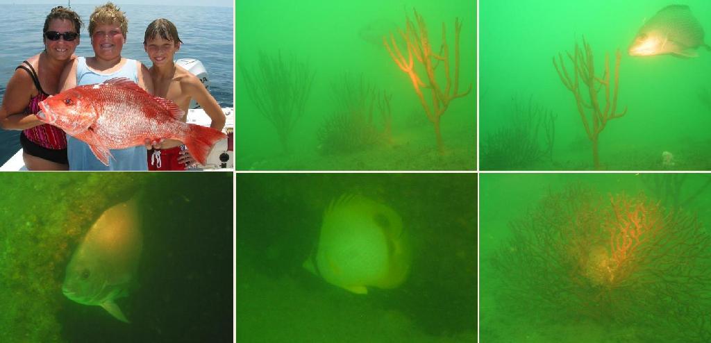 It was initially desired to inspect the Casino Magic Barge and it’s 2 APCs, but a boat was fishing on it upon arrival so the plan was diverted to first inspect the A-Barge and then visit the Casino Magic Barge. However, the visibility was so poor on the A-Barge that the Casino Magic Barge dive was aborted. The A-Barge is a 180' X 70' X 12' Deck Barge deployed during the Summer of 1984 in FH-1 and was one of the first vessels deployed by MGFB. On November 8, 2001, several large pieces of concrete were deployed on her deck and has effectively enhanced the reef. Although the visibility was poor, several pieces of concrete were seen confirming that at least some of the rubble made it thru Hurricane Katrina almost 2 years ago. The deck of the barge has several pieces of soft corals growing on it, a feature that many of the newer reefs do not exhibit. The poor visibility rendered fish counts futile, but several red snapper, gray snapper, sheepshead, spades, blue runners, and the like were observed. Several smaller fish like cocoa damsels, blennies, and a spotfin butterfly were also seen. Several red snapper were caught topside including one around 10 pounds showing that this reef is still a viable reef despite its 23 years of age. Placing the concrete on it’s deck in 2001 really enhanced its effectiveness and more consideration should be given to similar reef enhancements of flat deck barges in the future.