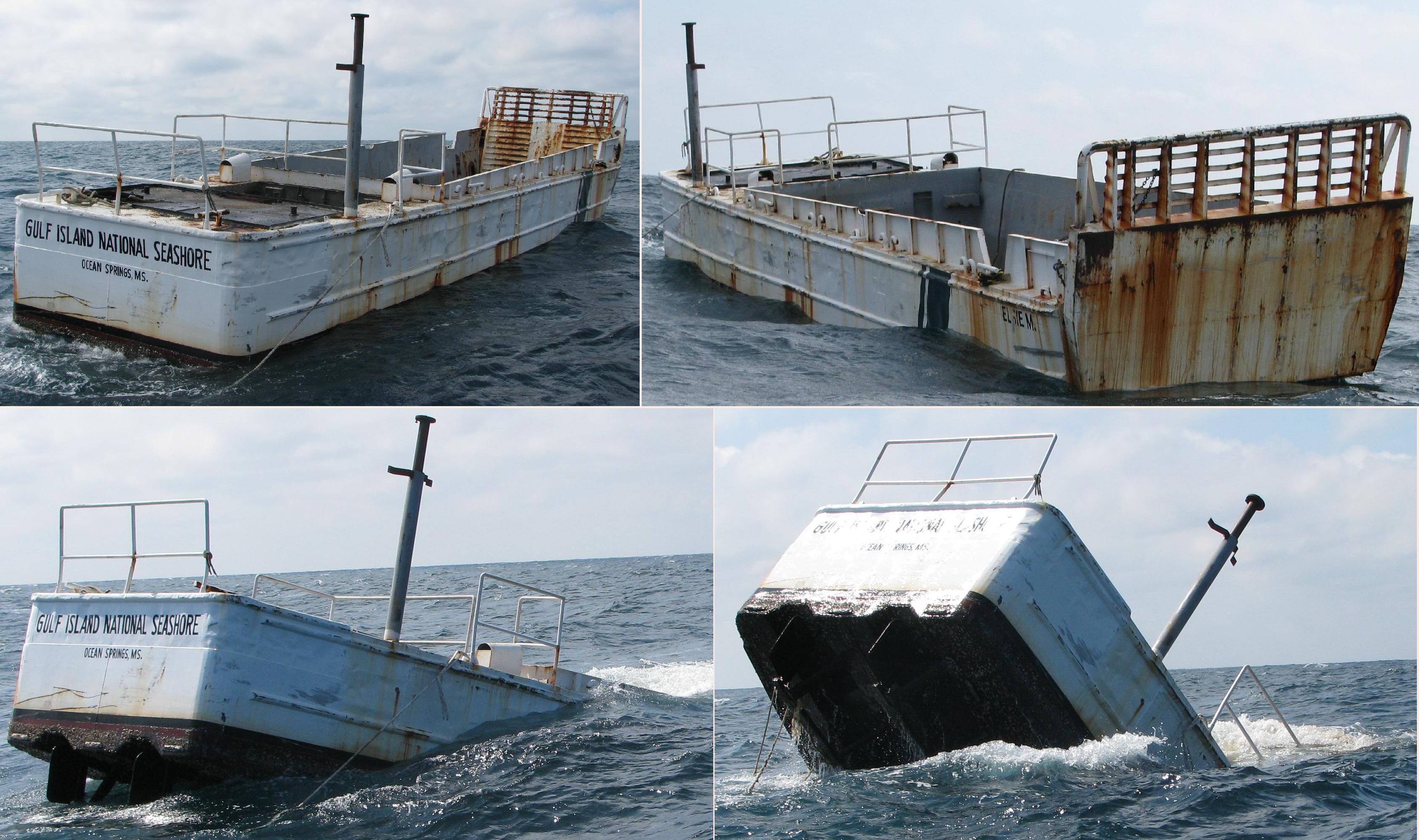 This 50' X 16' Landing Craft was donated by the Gulf Islands National Seashore after replacing the aged vessel. They used this vessel to transfer equipment from the mainland to the National Seashore Islands off Mississippi. This was the first visit since her October 11, 2008 deployment. Visibility was not ideal, but several juvenile red snapper and Triggerfish were sighted in addition to schooling bait fish like TomTates and Blue Runners. The Vessel is facing in a generally West direction with a Starboard mast head reaching the highest point at about 55' from the surface, followed closely by the bow landing grate at about 57'. Depth measurements along the starboard side and along the deck was 63' with the aft railing reaching to 60'. The Port side measured about 61' denoting a slight list. The bottom measured around 69' under both ends with the surrounding depth reading about 68'. Overall the reef is performing well but needs some more time to develop.
