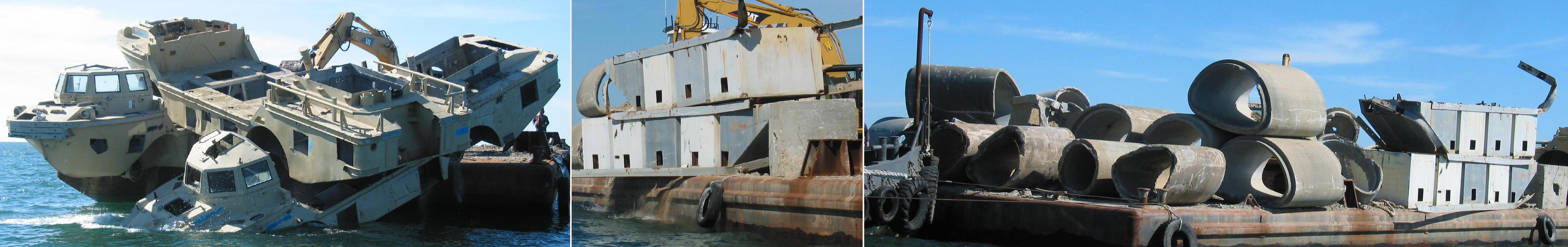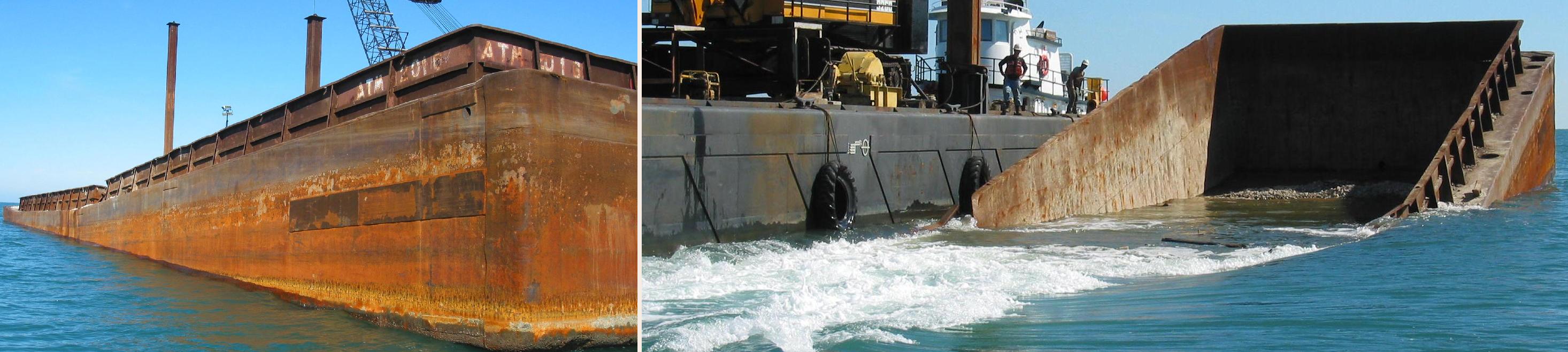 On November 13, the DMR and Matthews Marine were met at the South end of FH-12 for the deployment of a large Hopper Barge bearing the numbers ATM2016. The barge is estimated at 12' Tall, 195' long, and 35' wide. The barge was previously being used by Matthews Marine for the deployment of Limestone and Crushed Concrete. During one of her deployment efforts, the Barge buckled at the Center terminating its usefullness. Matthews Marine then donated the Barge as a Reef. Conditions were good with light NE winds @ 5 knots, Tide was at 0.8', the surrounding depth was 42' with a minimum depth of 27' recorded. Water flow started about 8AM and she finally yielded to the bottom at about 1130AM. The Bow is facing approximately 300°.
