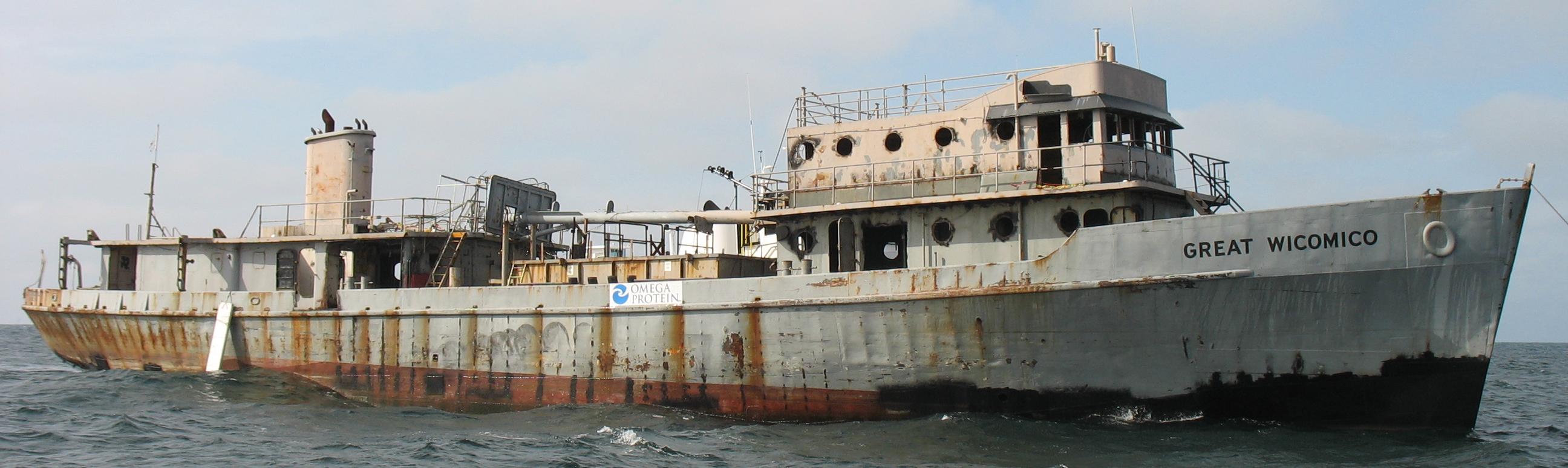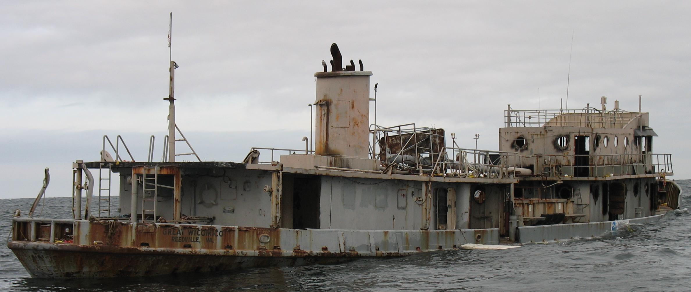 This 175' Pogey Boat was donated by Omega Protein and deployed in FH-13 on November 24, 2009. Previous attempts to visit the reef were met with poor visibility. This visit was much better, but still not ideal. Observations were only effective in the top 5-10 feet of the Structure. Below that, poor visibility and lighting hampered efforts. Most of the top of the structure and the railings measured 63' of depth with 61' measured at the top of light posts. There was a FAD that towered to 53' at the float. There was a horizontal laying mast that measured 73' of depth. Fish observations on this May 5, 2010 visit included a large school of small to medium Spade Fish, 2 large Trigger Fish, medium to large schools of Tom Tates (75-100), and a few small red snapper (15-20/<1lbs.). No other fish sighted, but this may be due to the poor conditions.