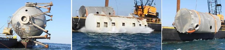 NASA Employee Bryon Maynard and his crew of 5 orchestrated this deployment of the BRT (Big Round Thing), the Lox (Liquid Oxygen) Tank, and Scotty's Beer Can in FH-13. The BRT was a Hydrogen Accumulator Tank (HAT) that was used in the testing of the Saturn V Engines at NASA’s Stennis Space Center. These three pieces were sunk in the Southwest End of FH-13 in 85 feet of water. The BRT has a water clearance of about 50' at this time. It looks like it will make a great reef. Bryon, Ben Powell, and Skip Roberts made Dives on the BRT as well as the Great Wicomico Pogey Boat. The other members of Bryon's crew were Jason Hopper, Danny Woods, and Steve Rathbun.