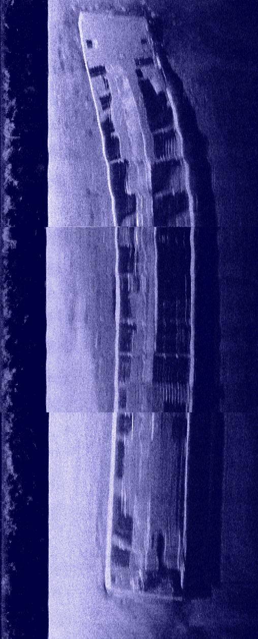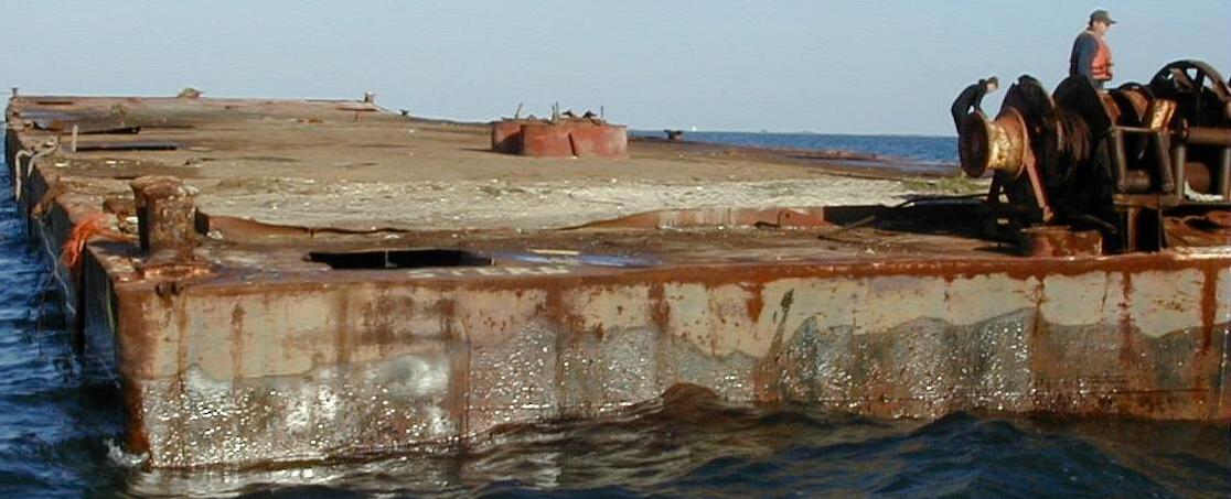 This 250' X 50' X 10' Deck Barge was deployed in the northwest corner of FH-4 on March 24, 2002 by Gulf Stream Marine (02April11 Report). Original plans were to place it in FH-12, but the barge was taking on water too fast and it was feared that the vessel would not float the distance. At the time of it’s sinking, the surrounding depth was reported at 28 feet and the minimum depth was 17 feet. On March 14, 2003 (03April10 Report) it was determined that the barge had moved about 600 feet to the northwest presumably by Storm surges. The new end coordinates were reported at 30°10.468'N/88°54.047 and 30°10.448'N/88°54.019'W and were verified on this visit.