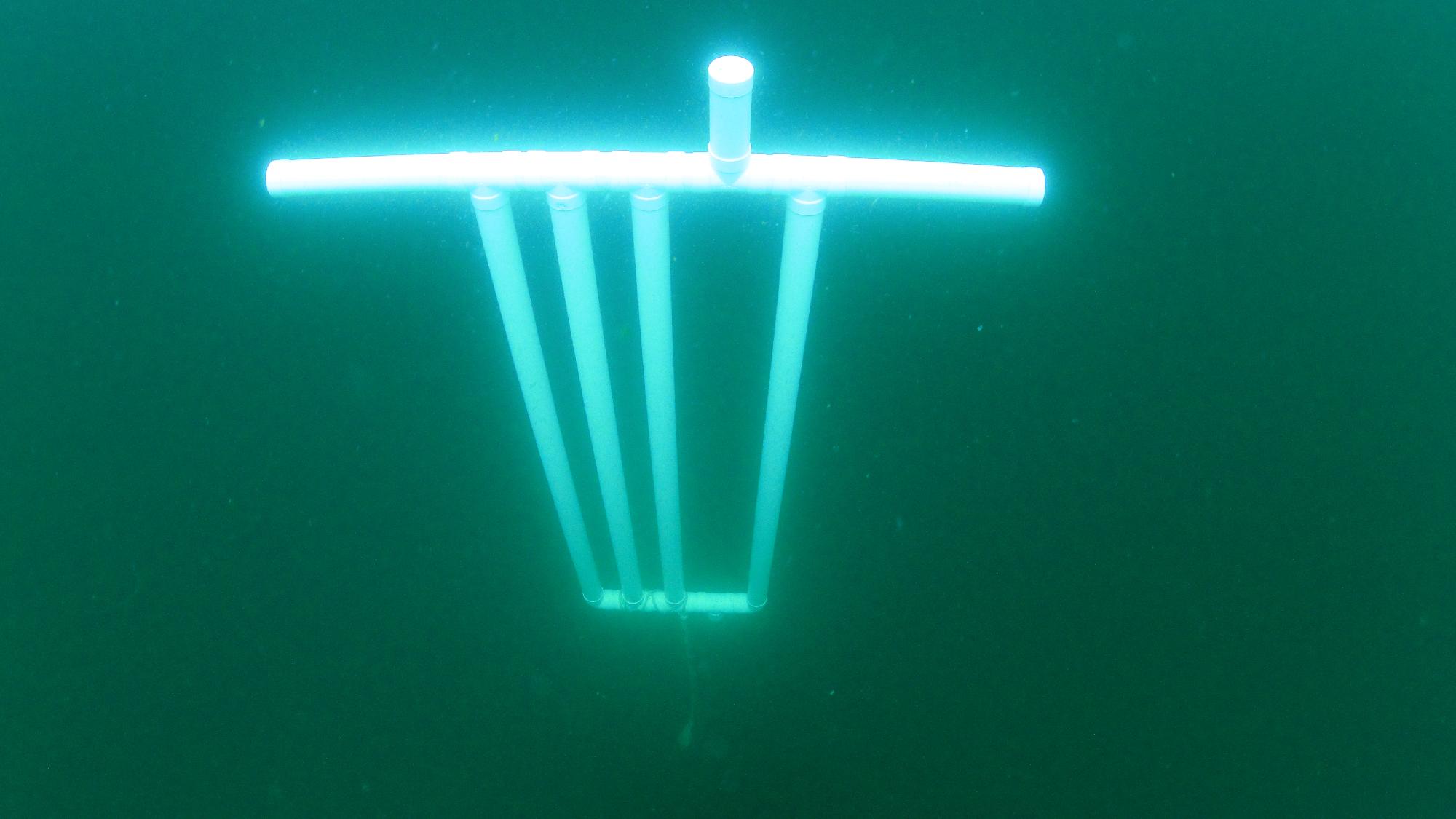 This grouping of Pyramids are located a little East of the Southern Star Shrimp Boat in FH-13. We chose to place our newly created FAD on this reef. The FAD is made up of 10 foot sticks of sewer pipe and an opening on each end to allow it to fill with water. Leaving just a little air in it, the top opening was glued shut. This left the rig manageable to get down to the reef. Once attached to the existing lift ropes on the Pyramid, the height was adjusted so the top was at about 50 feet during mean low tide. Once situated, air was pumped into the FAD using the Diver’s Octopus Regulator. After adequate buoyancy was achieved it was noticed that the chain did not get around adequate parts of the lift ropes so more rope was obtained from the boat and tied through the Pyramid holes. Once completed, the bottom cap was placed on the unit, but it would not stay on. It may not need this cap but a future design could use a threaded cap to avoid this problem. Overall the FAD deployment went smoothly. This particular design was modified from a cube design that looked like it would be too bulky and cumbersome to handle. Future monitoring and redesign will be conducted to do more of this kind of work.